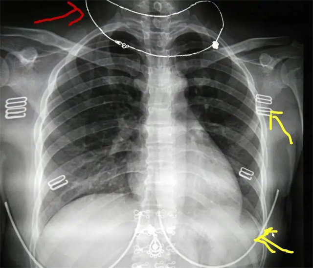 缺陷:兩肩胛骨未拉開肺野之外,吸氣不完全,且存在金屬飾品遮擋。
