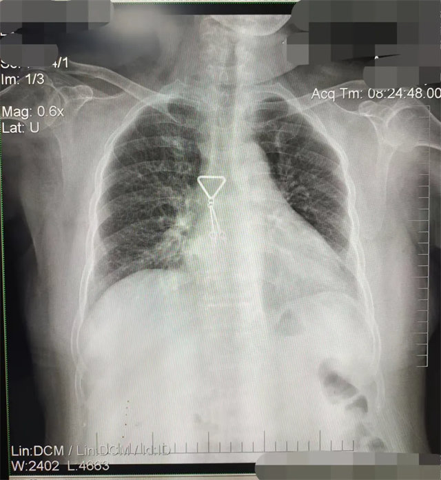 解決:去除金屬飾品及內(nèi)衣后重新按標(biāo)準(zhǔn)體位攝片即可。