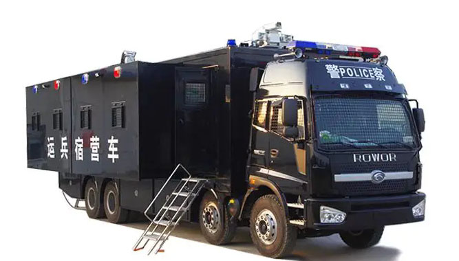 宿營車是為滿足特殊環(huán)境下野外執(zhí)行任務(wù)、提高后勤保障能力研制開發(fā)的專用車輛。由越野型二類底盤加裝大板式方艙組成,方艙通過液壓系統(tǒng)傳動(dòng)、電氣系統(tǒng)控制實(shí)現(xiàn)左右兩側(cè)自動(dòng)擴(kuò)展。車輛配有空調(diào)和燃油暖風(fēng)機(jī),可保證方艙內(nèi)的溫度恒定在人體最適合的溫度。車內(nèi)具有能同時(shí)滿足32人的住宿空間,集住宿、運(yùn)輸及影視娛樂為一體,滿足公安、部隊(duì)處理突發(fā)性任務(wù)的快速機(jī)動(dòng)需要。具有功能齊全、性能優(yōu)良、操作簡便、保障能力強(qiáng)、適應(yīng)性廣等特點(diǎn)。