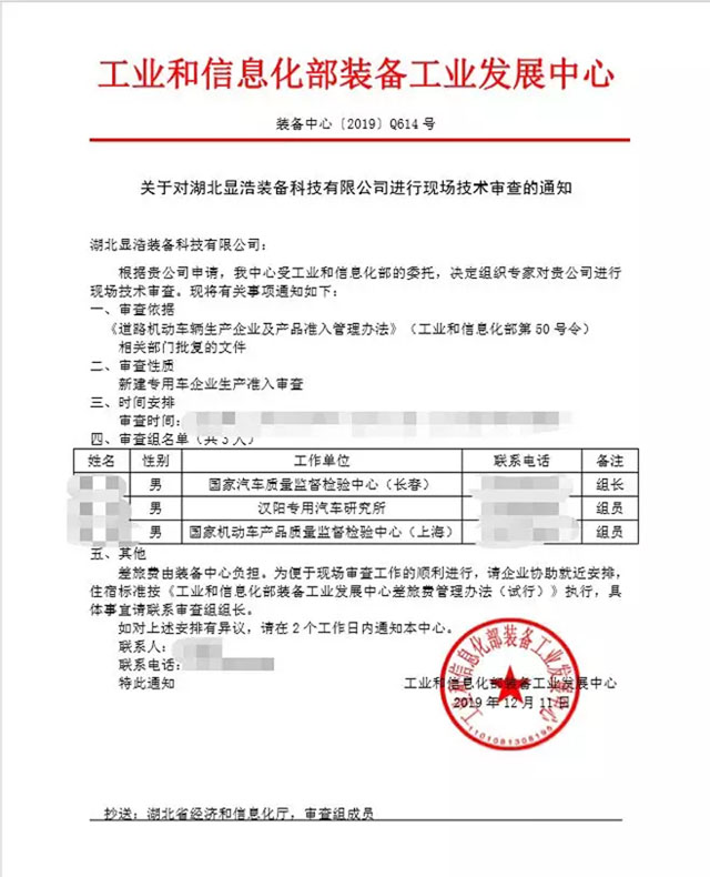 2019年12月19日湖北省顯浩裝備科技有限公司迎來了工信部委派的三位技術(shù)審查專家,三位專家對顯浩申請的專用車企業(yè)準(zhǔn)入進行現(xiàn)場技術(shù)審查。依據(jù)《道路機動車輛生產(chǎn)企業(yè)及產(chǎn)品準(zhǔn)入管理辦法》(工業(yè)和信息化部第50號令)經(jīng)過三天的嚴(yán)格審查。專家對顯浩在送血車、檢測車、監(jiān)測車、冷藏車等專用車的研發(fā)、生產(chǎn)、銷售、售后服務(wù)等能力方面給予高度認(rèn)可,并一次性通過了現(xiàn)場審查。隨后將審查情況及材料匯報國家工信部專家組審查。
