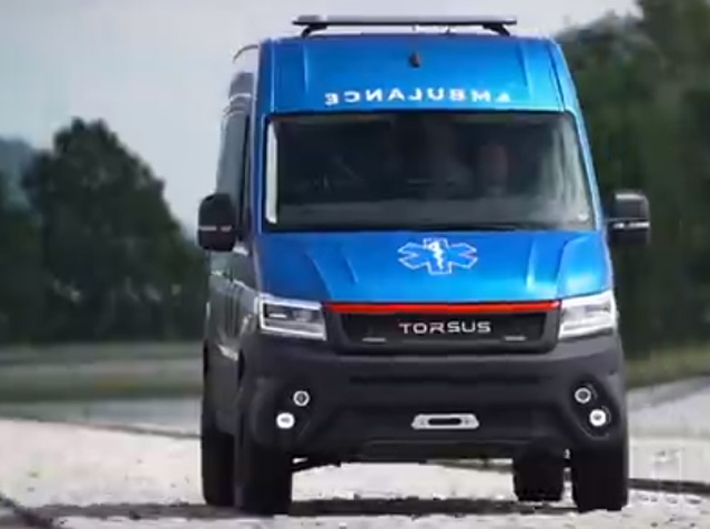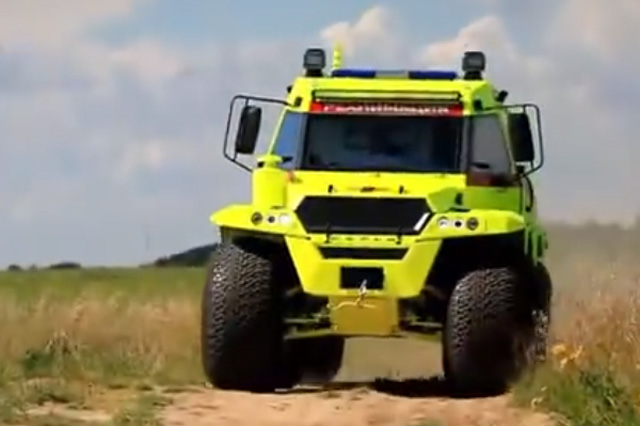 TORSUS PRAETORIAN,捷克共和國制造的大容量高性能車型??梢暂p松的穿越困難地形將病患從人跡罕至的地方運送到醫(yī)療機構(gòu)。大型車長8.4米,總重量是13.4噸。有3個擔架的放置空間,配備了一個自動舉升的系統(tǒng)。搭載一臺290馬力的發(fā)動機,最大扭矩為1150牛米,最高時速100公里每小時。
