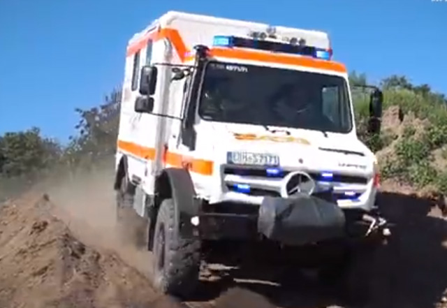 Mercedes Unimog U 4023,德國制造的堅固可靠的車輛??梢詾槠h地區(qū)的人提供醫(yī)療服務,車輛長6米,總重量為10.3噸。配備了自恢復絞盤輪胎充氣系統(tǒng)。發(fā)動機功率為231馬力,最高時速是89公里每小時。可以穿越森林山脈等困難的地形。也可以穿越水深1.2米的區(qū)域。