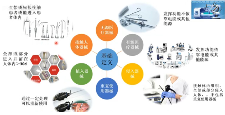 主要定義、風(fēng)險程度、結(jié)構(gòu)、接觸人體、使用形式、醫(yī)療效果和使用時限。首先是醫(yī)療器械的基礎(chǔ)定義,主要是根據(jù)醫(yī)療器械的機(jī)構(gòu)和功能特點(diǎn)來進(jìn)行劃分的。無源醫(yī)療器械不依靠電能或者其他能源,通過人體使用,發(fā)揮其功能的醫(yī)療器械。沒有動力源的醫(yī)療器械,有注射器,手術(shù)刀。有源醫(yī)療器械任何依靠電能或者其他能源,常見的有超聲影像設(shè)備DR、CT、醫(yī)療機(jī)器人等。侵入器械,接觸體內(nèi)組織身體內(nèi)部位的醫(yī)療器械。通過體表侵入人體介入手術(shù)使用的器材、一次性無菌手術(shù)器械暫時或者短期留在人體的醫(yī)療器械。侵入器械不包括重復(fù)使用的手術(shù)器械,我們常見的有,注射器和針頭,胃腸鏡、尿管、骨科耗材等。重復(fù)使用器械用于手術(shù)中進(jìn)行切割鉆鋸抓刮鉗抽夾等等過程。不連接任何有源醫(yī)療器械。通過一定的處理可以重新使用的無源醫(yī)療器械。常見的有:腹腔鏡、喉鏡、胃腸鏡等。植入器械,借助手術(shù)全部或者部分進(jìn)入體內(nèi)或者腔道里面?;蛘哂糜谔娲梭w上皮、眼表面,術(shù)后留在體內(nèi)一個月以上的。被人體吸收的醫(yī)療器械。常見的有心臟起搏器、心臟支架、人工關(guān)節(jié)、腦起搏器、口腔種植等。接觸人體器械:進(jìn)入體內(nèi)的醫(yī)療器械。醫(yī)用注冊器,手術(shù)到、內(nèi)窺鏡、起搏器。大部分屬于接觸人體醫(yī)療器械范疇的。