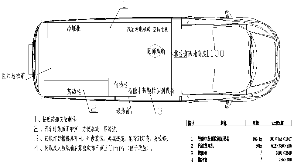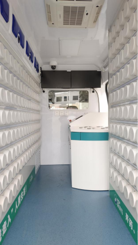 移動中藥房車車廂頂部安裝LED滾動屏,顯示接口與發(fā)藥設(shè)備對接,顯示所發(fā)藥品名稱。頂部還安裝紫外燈以便對整個車廂進(jìn)行殺菌。車輛有GPS,車內(nèi)提供5G(含4G)網(wǎng)絡(luò)連接。配置了駐車空調(diào)和行車空調(diào),以便停車熄火時為車廂內(nèi)提供溫濕度調(diào)節(jié)。
